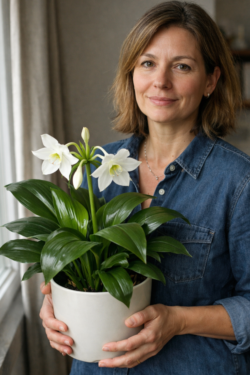 Еухаріс приваблює не лише цвітінням, а й декоративним листям — рослина виглядає охайно та дорого навіть поза періодом цвітіння. Це саме той варіант, коли квітка прикрашає інтер’єр постійно, а не “час від часу”.