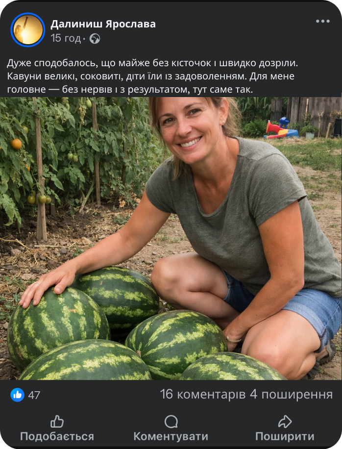Кавуни виростають до 25 кг — це той випадок, коли результат видно одразу, без дрібноти й розчарувань.